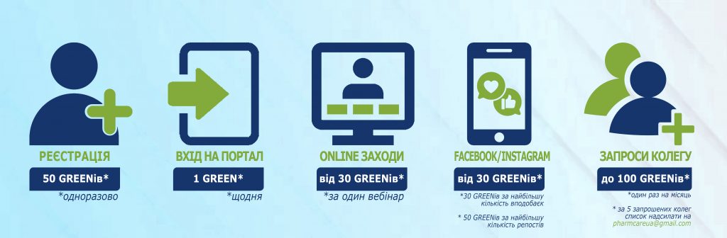 Підписник, який зробить найбільшу кількість репостів наших публікацій на сторінці фейсбук за місяць, отримає 50 GREENів додатково. Для цього в кінці кожного місяця не пізніше останнього календарного дня місяця потрібно направити скріни репостів на електронну скриньку pharmcareua@gmail.com