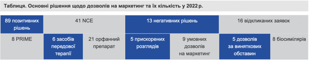 EMA робить внесок у боротьбу з пандемією COVID-19 і mpox (раніше — віспа мавп), прискорюючи розробку та схвалення безпечних та ефективних ліків (Paxlovid (PF-07321332/ритонавір) і Evusheld (тиксагевімаб, цилгавімаб)), а також вакцин (розширення показань Jynneos та Imvanex). Досягнуто скорочення термінів розгляду до менш ніж 150 робочих днів.Таблиця. Основні рішення щодо дозволів на маркетинг та їх кількість у 2022 р.