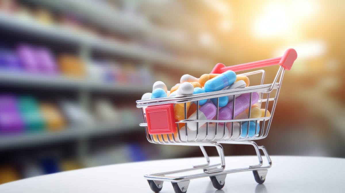 Packaged pills in a basket with a defocused backdrop of pharmacy shelves.