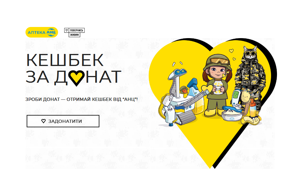 Аптеки «АНЦ» та Фонд «Повернись живим» запустили чергову спільну ініціативу – благодійну акцію під гаслом «Кешбек за донат». Відтепер кожен клієнт аптек «АНЦ», «Копійка» або «ШАР@» зможе отримувати на свій клієнтський бонусний рахунок 1% від суми донату. Зібрані бонуси пацієнти зможуть витрати на ліки та товари для здоров’я в аптеках мережі.