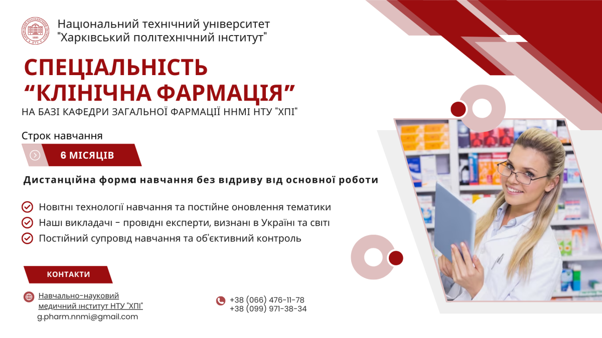КАФЕДРА ЗАГАЛЬНОЇ ФАРМАЦІЇ НТУ «ХПІ» (8) Facebook пропонує фармацевтам отримати нову спеціальність з 6 місяців Спеціалізація “Клінічна Фармація”  дає можливість працювати на посаді клінічного фармацевта та: